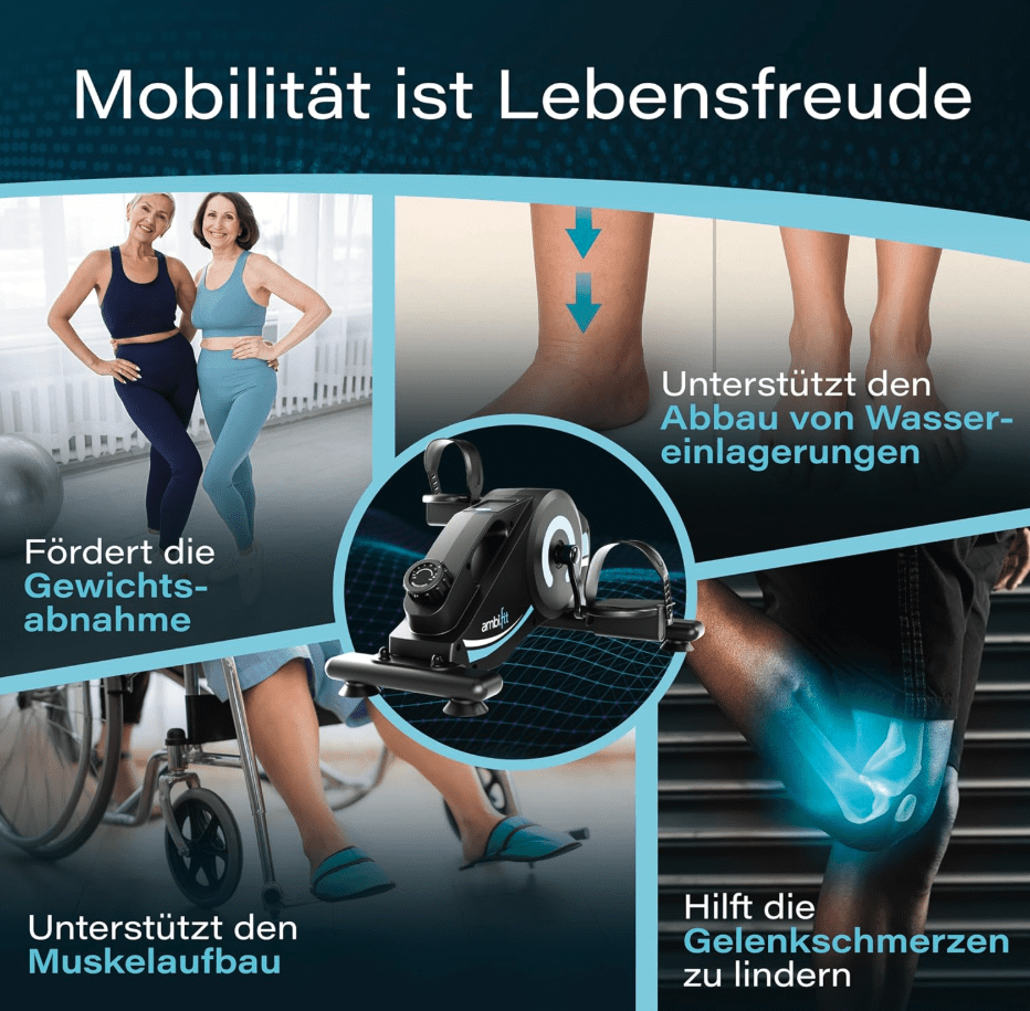 Der größte Vorteil des ambi.fit Pedaltrainers liegt jedoch in seiner Flexibilität und Effektivität. Sie können in Bewegung bleiben und Ihre Fitness steigern, Ihre Durchblutung fördern und Stress abbauen, und das ganz bequem von Zuhause aus, wann immer es Ihnen passt. Kein Fitnessstudio nötig!