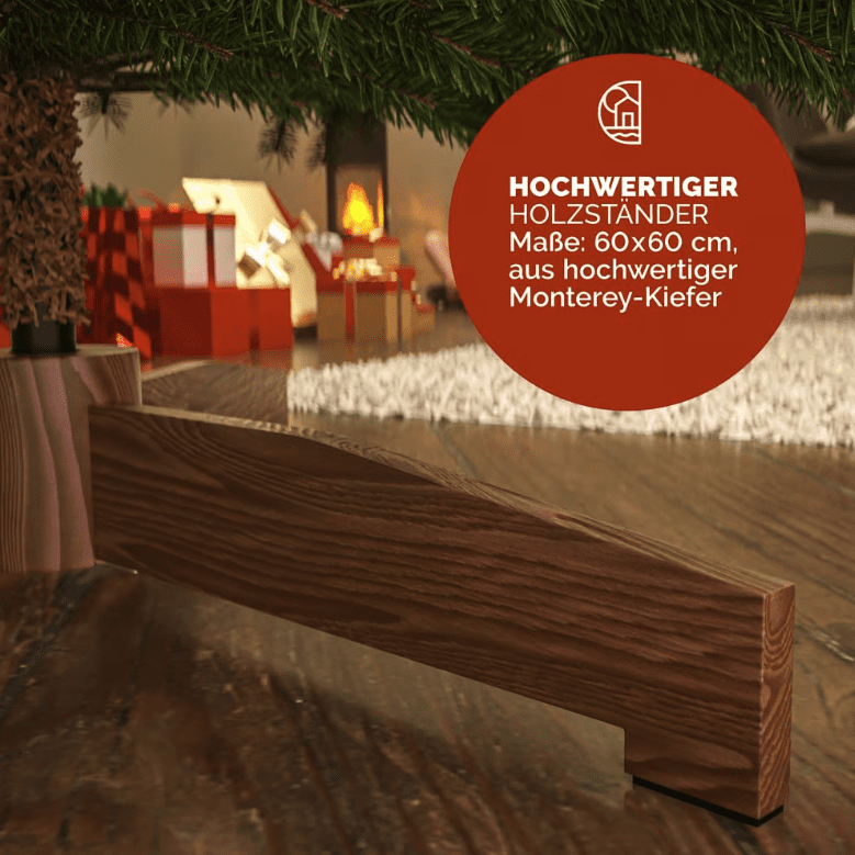 Ein weiterer Pluspunkt ist der stabile Baumfuß, welcher aus hochwertigem FSC®-zertifiziertem Holz gefertigt ist. Mit einem Durchmesser von 70 cm gewährleistet er einen sicheren Stand und rundet den hohen Qualitätsstandard des Baumes ab.