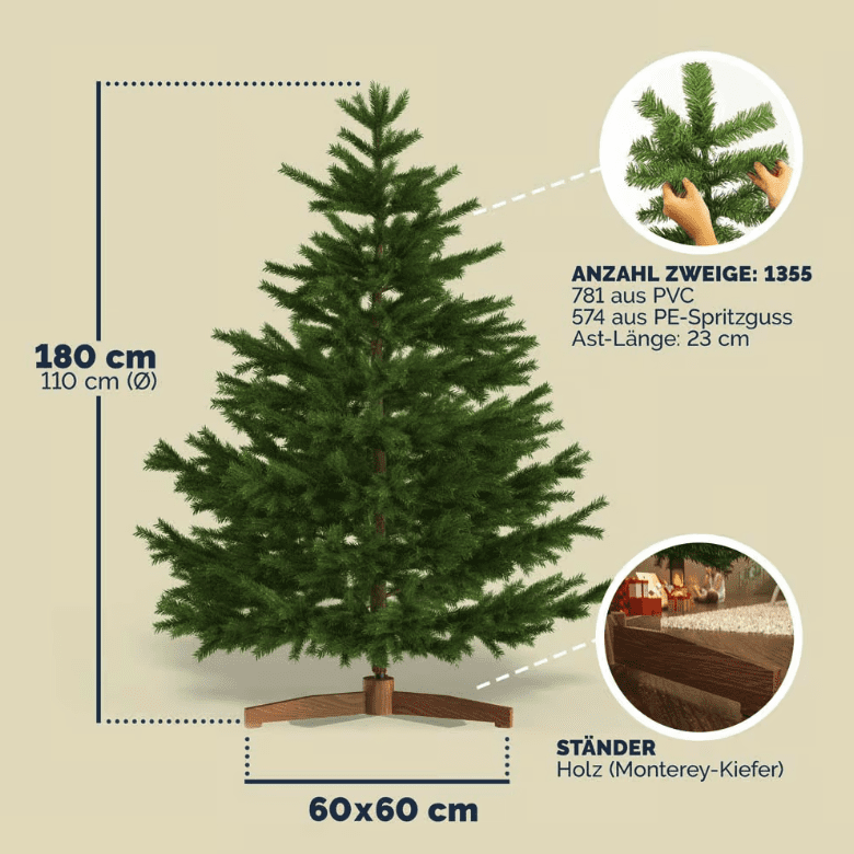 Der Christbaum besitzt einen beachtlichen Durchmesser von 111 cm, wodurch er genügend Platz für viel Weihnachtsschmuck bietet. Die Äste des Baums wurden aus einem hochwertigen Spritzgussmix aus PE und PVC hergestellt, der für eine hohe Langlebigkeit und Robustheit sorgt. Besonders hervorzuheben sind die insgesamt 1355 Astspitzen, die dem Baum ein volles und gesundes Erscheinungsbild verleihen.