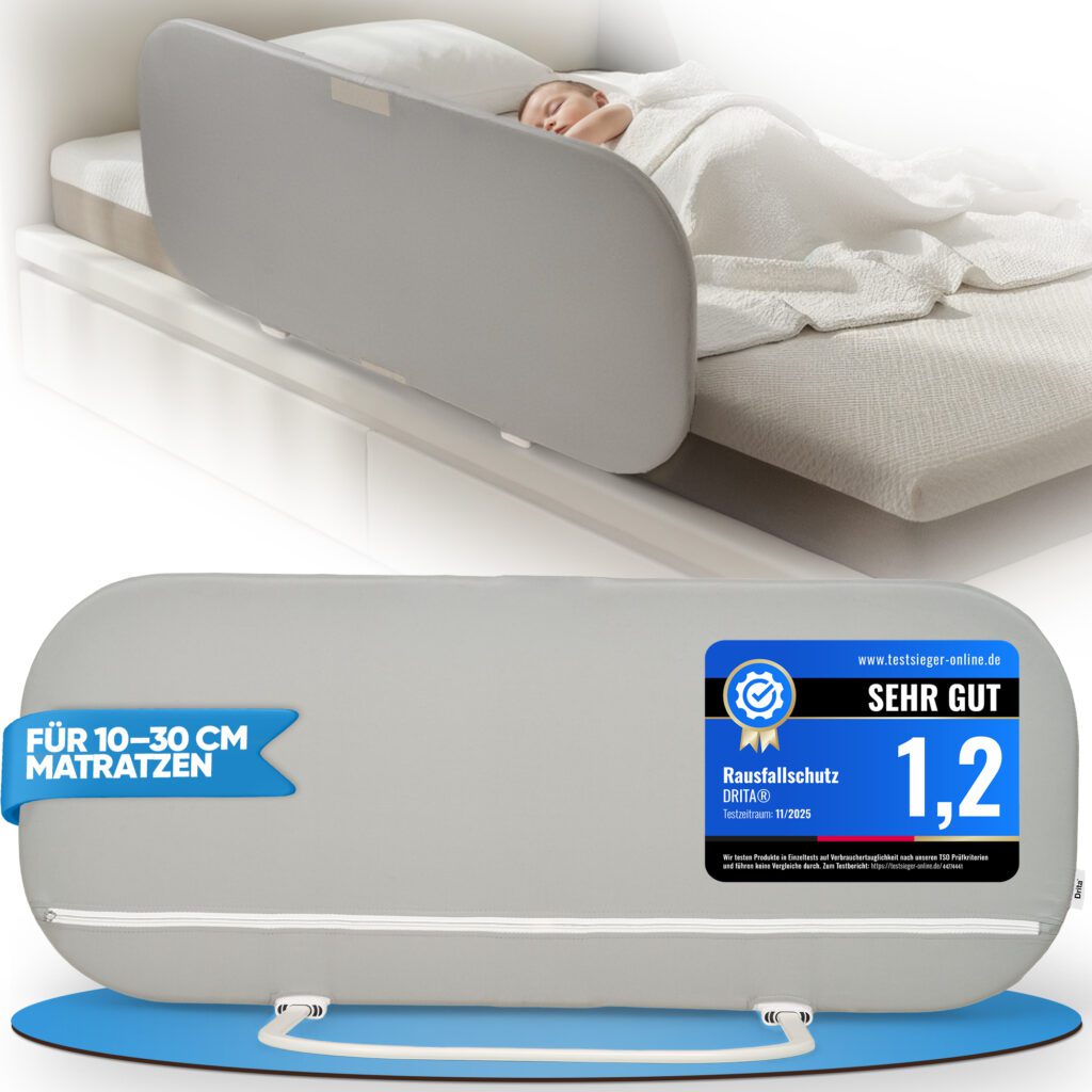 Im Rahmen unseres Produkttests haben wir den Rausfallschutz der Marke DRITA® unter die Lupe genommen. Besonders hervorzuheben ist, dass das DRITA® Bettgitter effektiv verhindert, dass Kinder im Schlaf aus dem Bett fallen. Es ist so konzipiert, dass es einfach unter die Matratze geschoben und durch eine stabile Metallkonstruktion sicher fixiert wird. Ein weiterer Pluspunkt des Produkts ist seine klappbare Bauweise. Mit nur wenigen Handgriffen lässt sich der Rausfallschutz aufstellen oder zusammenfalten, was es ideal für den Alltag und auf Reisen macht. Um die Produktqualität langfristig zu gewährleisten, empfehlen wir ausschließlich Handwäsche. So bleiben Material, Form und Funktion optimal erhalten.