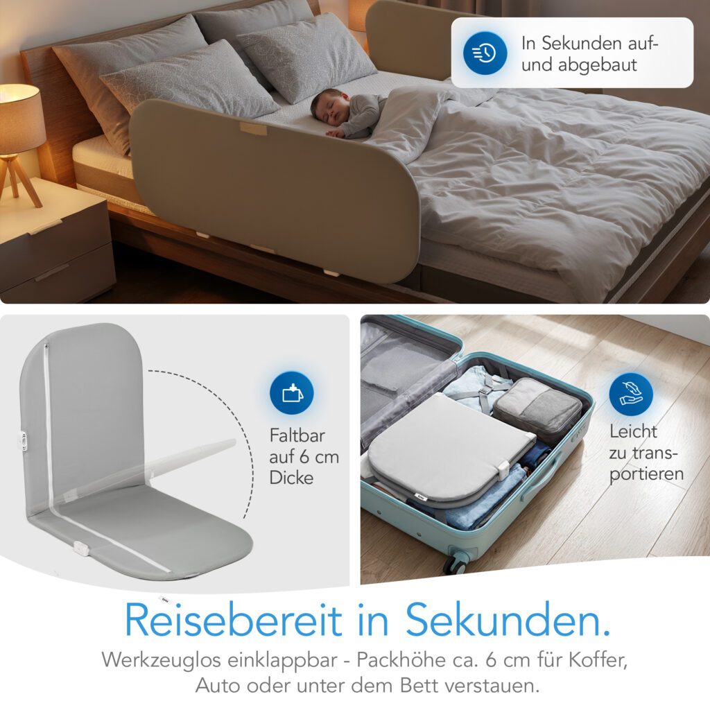 Ein weiterer Pluspunkt ist die Mobilität des Rausfallschutzes. Es kann in Sekundenschnelle zusammengeklappt und platzsparend verstaut werden. Damit qualifiziert sich das Bettgitter als idealer Begleiter für Reisen oder beim Übernachten bei den Großeltern.