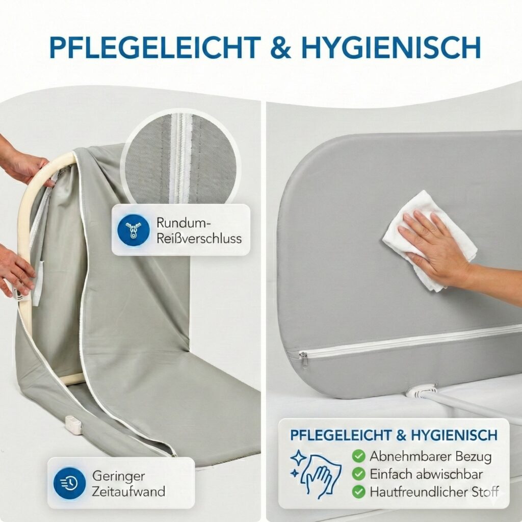 Das Produkt zeichnet sich zusätzlich durch seine Pflegeleichtigkeit aus. Bei Bedarf kann der Bezug mühelos abgenommen und per Hand gewaschen werden.