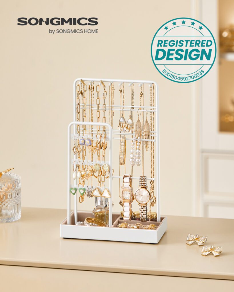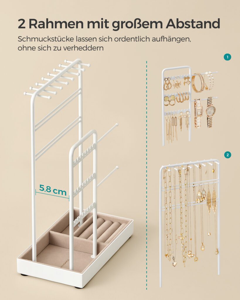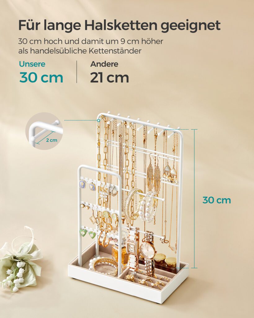 Insgesamt sorgt der Schmuckständer der Marke SONGMICS für eine übersichtliche und stilvolle Aufbewahrung für eine Vielzahl von Schmuckstücken.
