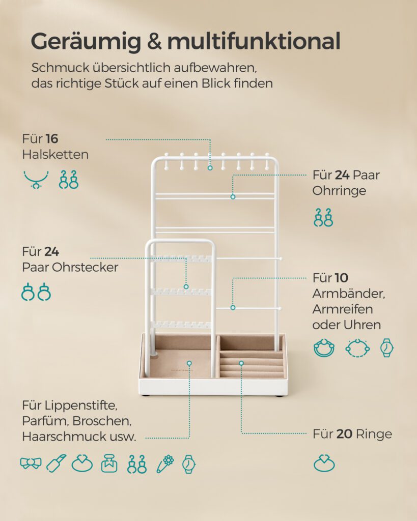 Unser neuester Produkttest dreht sich um den Schmuckständer der Marke SONGMICS, der sich durch seine Geräumigkeit und Vielseitigkeit auszeichnet. Der Ständer bietet eine Fülle von Möglichkeiten, um verschiedenste Arten von Schmuck zu organisieren. So finden Sie Löcher und Schlitze für bis zu 24 Paar Ohrstecker oder Ohrringe. Zudem stehen Ihnen 2 Stangen zur Verfügung, die Platz für 10 Armbänder, Armreifen oder Uhren bieten. Auch an Halterungen für Halsketten wurde gedacht: 16 spezielle Haken können diese aufnehmen. Zudem verfügt der Schmuckständer über ein Schmucktablett am unteren Ende, welches sich optimal für die Aufbewahrung von Ringen, Lippenstiften, Broschen, Haarnadeln und Ähnlichem eignet.