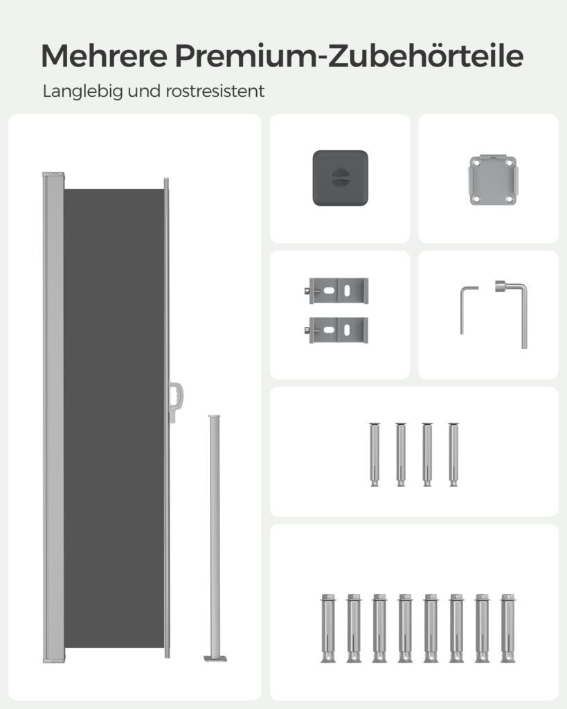 Eine Seitenmarkise ist ein unverzichtbares Accessoire für alle, die ihre Terrasse, Balkon oder Außenbereiche optimal nutzen und schützen möchten. Sie dient nicht nur als wirksamer Sicht- und Windschutz, sondern auch als variabler Sonnenschutz. Mit einer Seitenmarkise kann man einen gemütlichen und geschützten Außenbereich schaffen und die Außenfläche um ein vielfaches flexibler nutzen. Beim Kauf einer Seitenmarkise sollte auf verschiedene Aspekte geachtet werden. Dazu zählen die Qualität der Materialien, das Handling, die Ausziehlänge und -höhe sowie letztlich auch das Design. Die Marke des Produkts spielt ebenso eine wichtige Rolle, da sie oft Aufschluss über die allgemeine Qualität und Langlebigkeit des Produkts geben kann. In unserem aktuellen Test haben wir eine Seitenmarkise der Marke SONGMICS genauer unter die Lupe genommen.