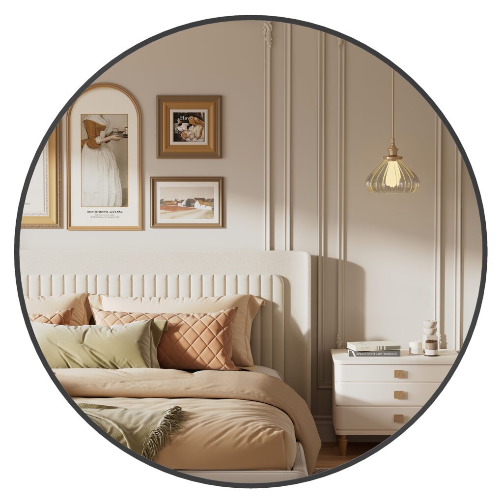 Darüber hinaus sorgt der Spiegel für eine spürbare Verbesserung der Raumwirkung und der Lichtverhältnisse. Die hochreflektierende Glasqualität verstärkt das vorhandene Licht und schafft durch die Spiegelung eine optische Weite, wodurch insbesondere kleinere oder lichtarme Räume heller und größer wirken. Der schlichte, elegante Rahmen aus Aluminiumlegierung unterstreicht die moderne Optik des runden Spiegels und ermöglicht eine harmonische Integration in unterschiedlichste Einrichtungsstile.