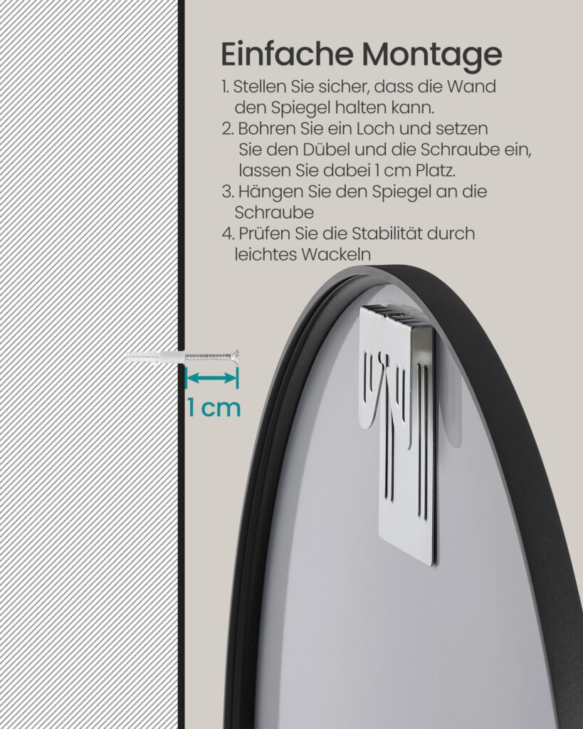 Für eine optimale und sichere Nutzung des Spiegels sollte vor der Montage zunächst geprüft werden, ob die Wand eben, stabil und trocken ist, da unebene oder instabile Flächen das Spiegelbild verzerren können. Anschließend empfiehlt es sich, die Montageanleitung sorgfältig zu befolgen. Bereiten Sie dazu eine Bohrmaschine und einen Schraubendreher vor, markieren Sie die vorgesehenen Bohrpunkte gemäß Anleitung, bohren Sie die Löcher und setzen Sie die Schrauben ein. Zum Schluss wird der Spiegel mithilfe der rückseitigen Haken sicher an den in der Wand befestigten Schrauben eingehängt. So ist eine korrekte Befestigung gewährleistet und der Spiegel kann seine volle Wirkung optimal entfalten.