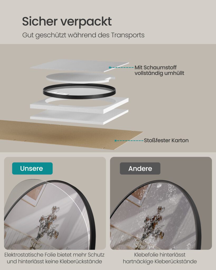 Schon die Lieferung des SONGMICS Spiegel rund zeugt von Professionalität. Die Verpackung ist sorgfältig gestaltet und schützt den Spiegel optimal vor Schäden während des Transports. Schon auf den ersten Blick wird deutlich, dass es sich bei diesem Produkt um eine hochwertige Qualität handelt. Der Spiegel ist makellos und weist keinerlei Kratzer oder sonstige Makel auf. Das schafft bereits beim Auspacken einen positiven Eindruck und Vorfreude auf die Verwendung.
