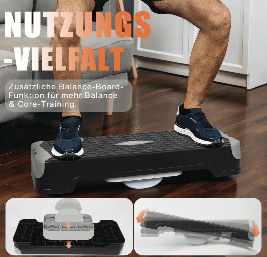 Dieses Produkt punktet durch seine Vielseitigkeit und benutzerfreundliche Eigenschaften. Es verfügt über eine 2-fache Höhenverstellbarkeit (10 & 15 cm), die eine breite Palette von Trainingsintensitäten ermöglicht. Die Nutzung als Stepper oder Balance-Board bietet unterschiedliche Trainingsmöglichkeiten und trägt dazu bei, das Training abwechslungsreich zu gestalten.