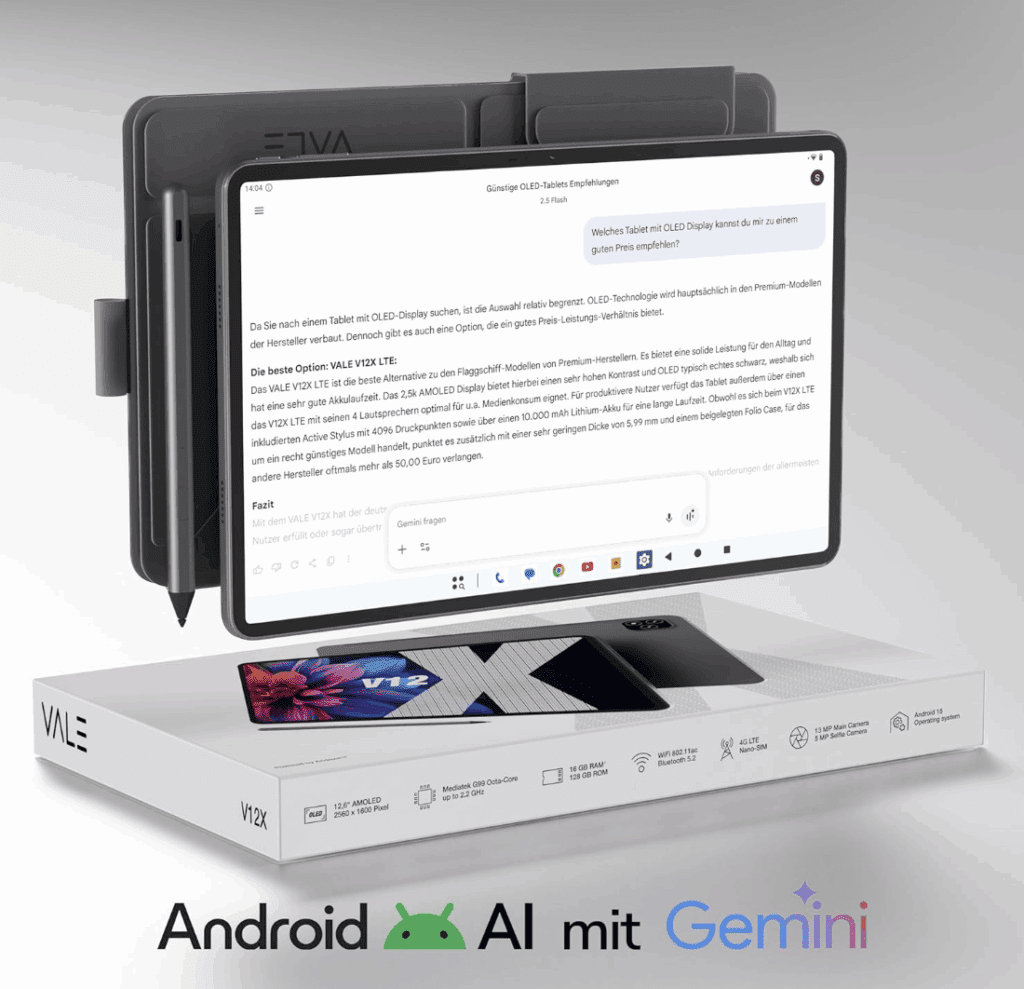 Das VALE Tablet überzeugt durch eine starke Kombination aus technischen Aspekten. Dazu zählen ein hochauflösendes 12,6″ AMOLED-Display und leistungsstarke Hardware. Zusätzlich ist es bereits mit dem modernen Android 15 Betriebssystem ausgestattet und unterstützt Gemini AI, welches weitere Anwendungsmöglichkeiten eröffnet.