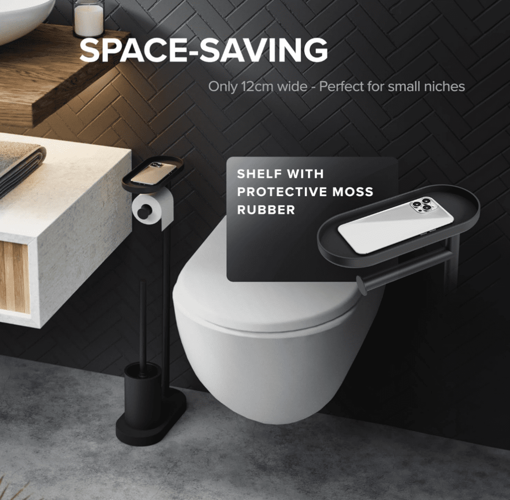 Die Tysnes WC-Garnitur 3 in 1 der Marke Ovimar ist ein praktisches Accessoire für das Badezimmer. Die Stand WC-Garnitur vereint drei Funktionen in einem Produkt: Sie dient sowohl als WC Rollenhalter als auch als WC Bürstengarnitur. Zudem verfügt sie über eine nützliche Ablage. Diese kann für verschiedene Zwecke genutzt werden, wie beispielsweise als Halterung für ein Handy oder als Platz für eine Packung Feuchttücher.