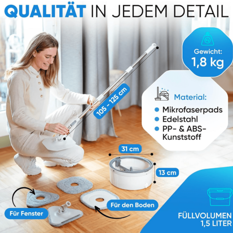 Darüber hinaus bietet das Wischmopp-Set ein hohes Maß an Flexibilität durch zwei verschiedene Aufsätze. Der eine eignet sich hervorragend für das Reinigen von Böden, während der andere speziell für Fenster konzipiert wurde.